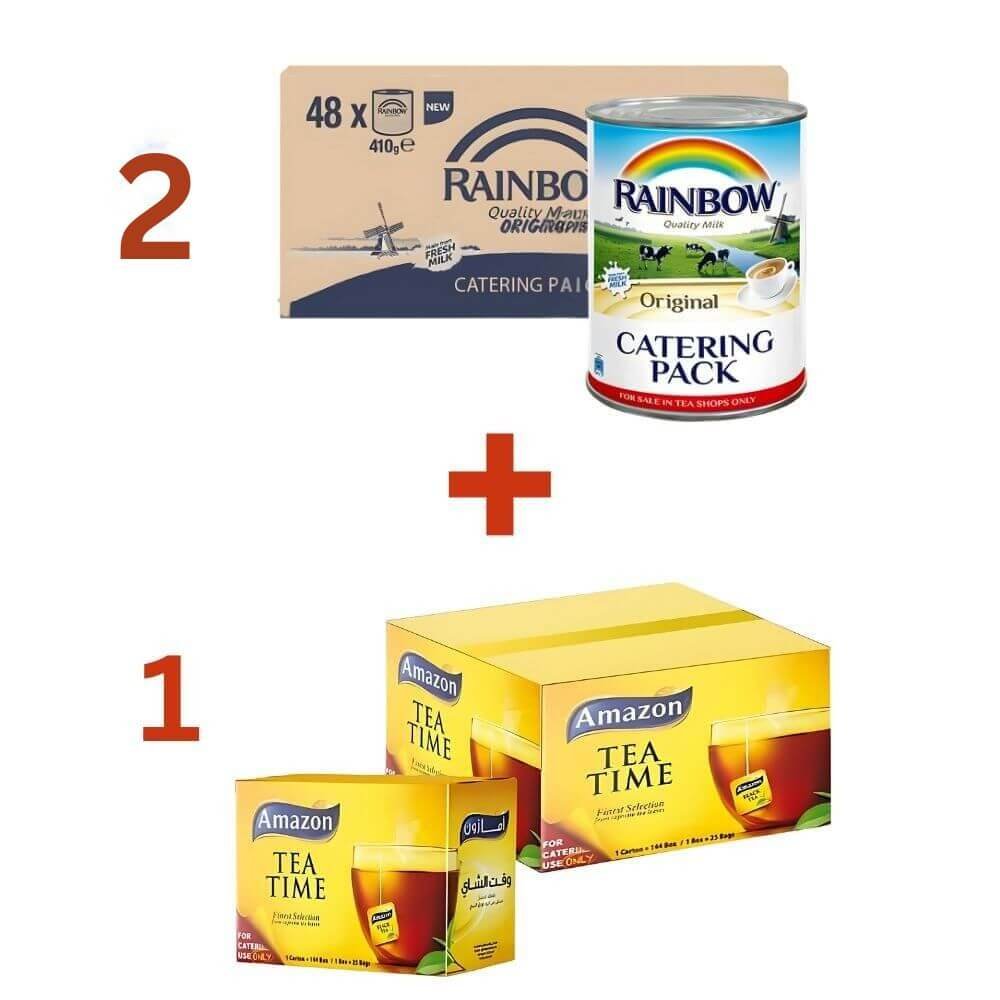 2 Cartoon Rainbow Milk + 1 Cartoon Amazon Catering Tea bags 2Cartoons Rainbow Milk(410g × 48)+1Cartoon Amazon Catering Tea Bags(144×25) Offer