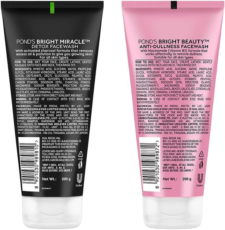 Ponds Bright Beauty Anti-Dullness Facewash with Vitamin B3, 200gm + Ponds Bright Miracle Detox Facewash with 10X Power of Charcoal, 200gm