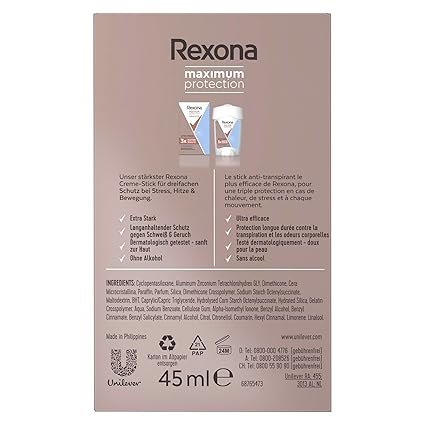 Discover unbeatable confidence with Rexona Maximum Protection Deodorant Cream Stick Fresh 45ml. Specially developed with TRIsolid™ technology, this antiperspirant provides Rexona’s strongest protection against sweat and body odor, keeping you dry and fresh even during the most demanding days.