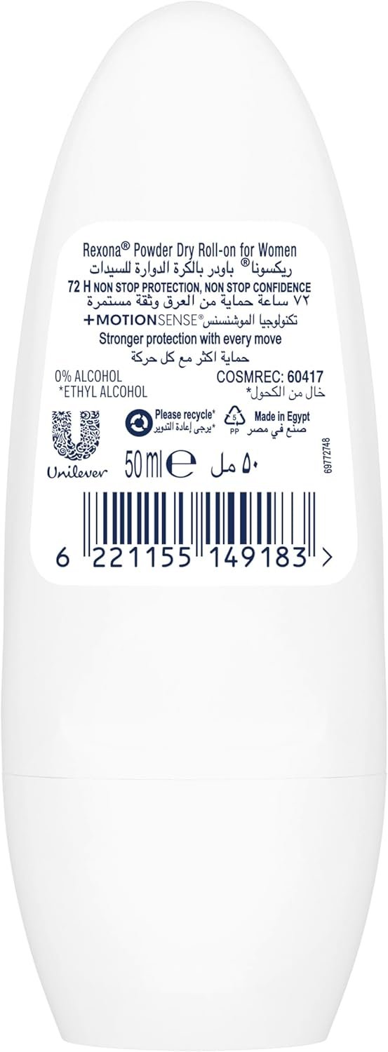 REXONA Women Antiperspirant Deodorant Roll On, 72 hour sweat & odor protection, Powder Dry, with MotionSense technology, 45ml