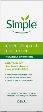 Give your skin the hydration it craves with Simple Replenishing Rich Moisturiser (125ml) – a deeply nourishing formula from the UK’s No.1 skincare brand. Designed to comfort even the most sensitive skin, it delivers up to 12 hours of lasting moisture without irritation.